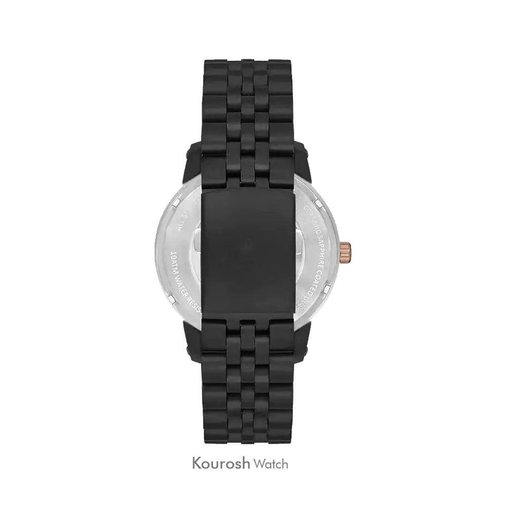 صفحهی این ساعت به رنگ مشکی طراحی شده و نشانگرها و عقربههای رزگلد درون آن جای گرفتهاند. این ترکیب رنگی نه تنها ظاهری لوکس و مدرن به ساعت میبخشد، بلکه خوانایی صفحه را نیز افزایش میدهد. عقربهها و نشانگرهای رزگلد با پسزمینهی مشکی تضاد زیبایی ایجاد کردهاند که به استایل کلی ساعت جلوهای منحصر به فرد میدهد.